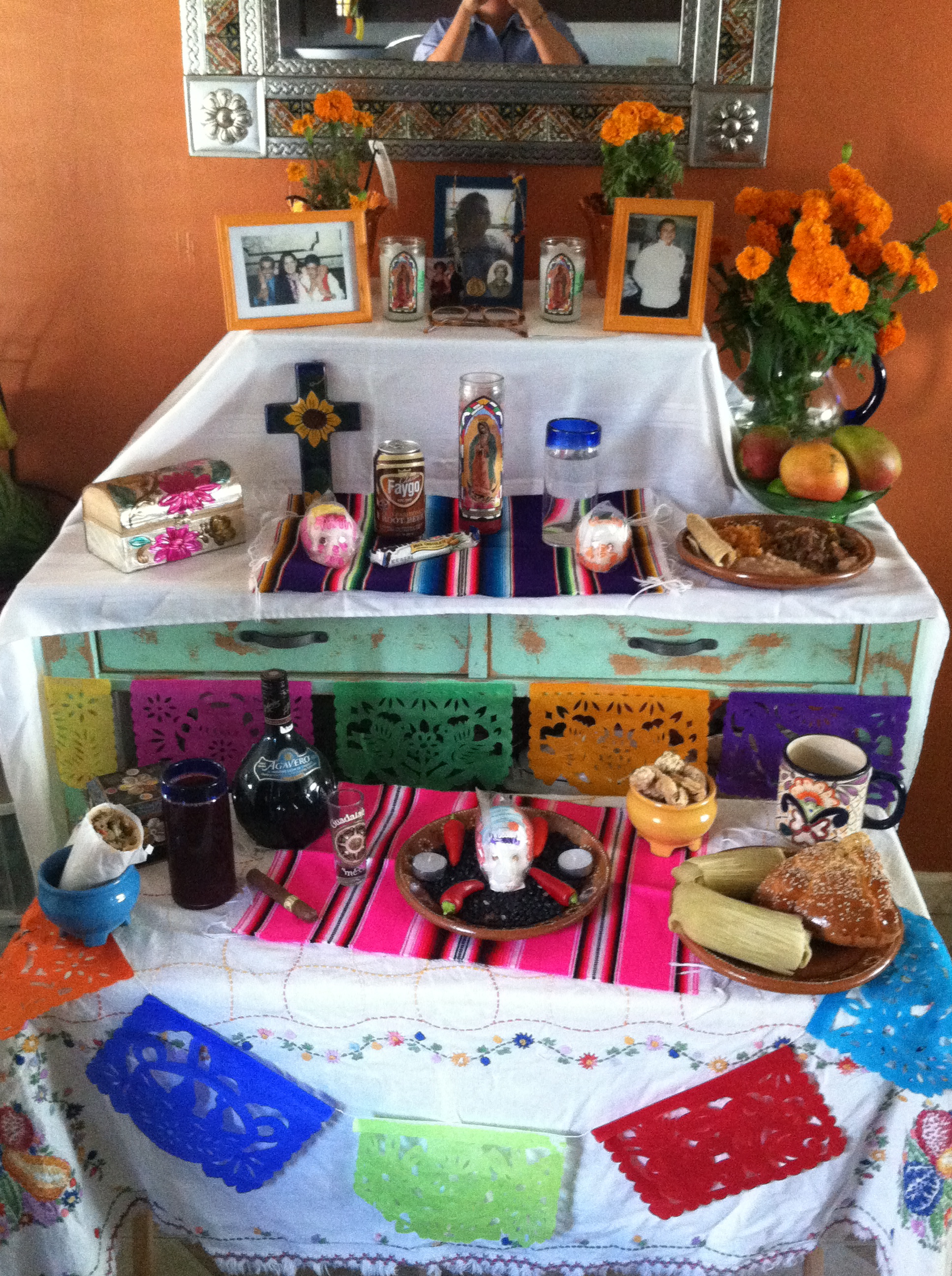 Día de los Muertos (Day of the Dead) is a time in which we commemorate and receive our loved ones from spirit world. We welcome them back into the physical world and celebrate them and honor them so that they may know they live in our hearts and memories, still. This tradition comes from the very complex and intricate collision of our ancestors, pre-Columbian cultures such as Mayan and Aztec, and Spanish invaders who forced Catholicism into the beliefs of the indigenous people. (Visit http://www.inside-mexico.com/featuredead.htm to learn more.)