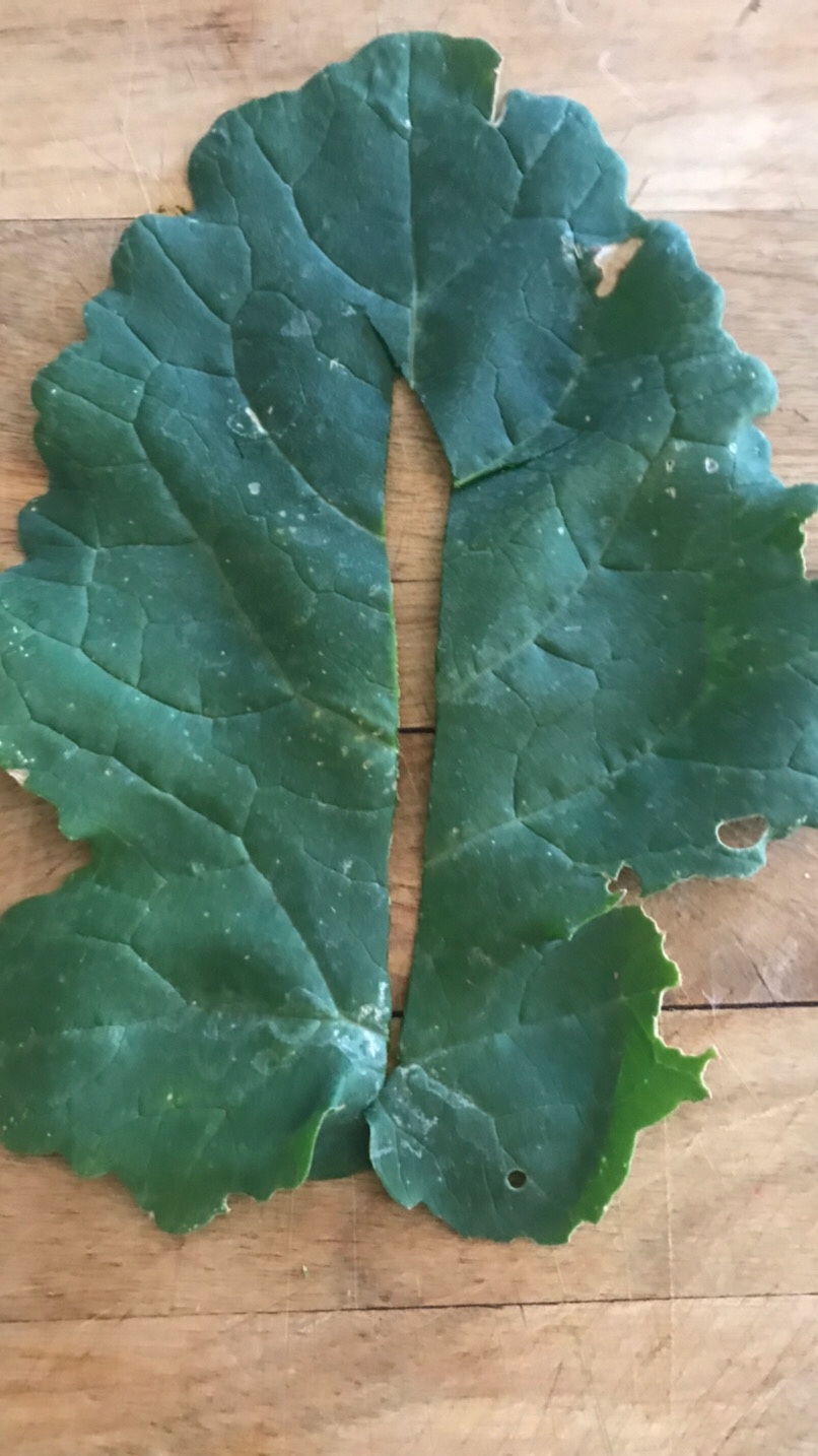 - First I cut off the stem from all of the collard leaves.